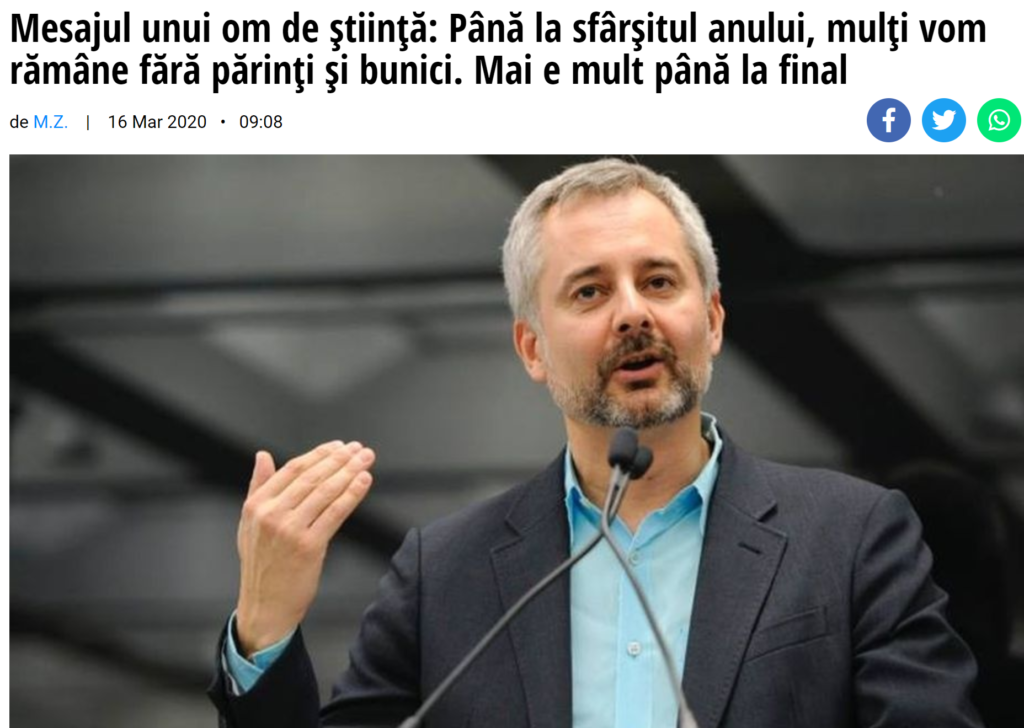 I was just saying the experts are coming out into the spotlight and that, bitterly, I'm glad about this. One example is the researcher Romanian-born Albert-László Barabási, who talks about the reason for why we need to 'stop the world', even if the virus is unstoppable. It is not clear whether this article from Adevărul is based on an interview with him or a translation of another article, but it's a very good example of science communication. Here's a quote