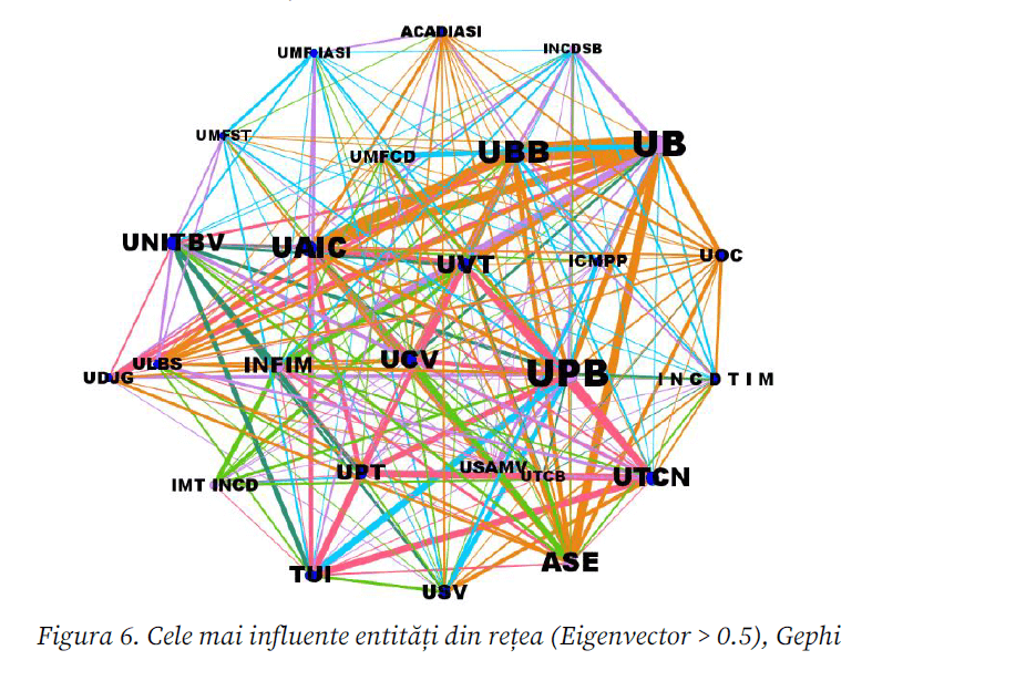 La nivel național, conform indicatorului Eigenvector Centrality care măsoară calitatea conexiunilor (nu doar cu cine ești conectat, ci cât de bine conectați sunt și prietenii tăi), Politehnica București este liderul absolut cu scorul maxim de 1,00, urmată de Universitatea din București (0,94) și Universitatea Tehnică din Cluj-Napoca (0,85). Surpriza vine de la Universitatea din Craiova, plasată pe locul patru cu același scor de 0,85, care devine lider la capitolul brokeraj. Universitatea Babeș-Bolyai ocupă locul cinci (0,84), fiind un actor central stabil în toate domeniile.