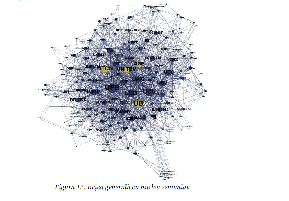 Universitatea Transilvania Brașov este în nucleul rețelei după toți algoritmii – o universitate de dimensiuni mijlocii fără finanțare imensă, dar cu participare diversificată în mai multe domenii. La fel și Universitatea Suceava. Cele două performează mult peste greutatea lor, fiind de trei ori mai mici decât alte instituții mai bine cotate.” Adrian Hatos menționează și Universitatea din Craiova, care ocupă locul patru la influență națională și conduce la capitolul brokeraj, capacitatea de a conecta alții între ei.